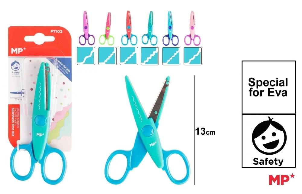 Nożyczki dziecięce z plastikowym korpusem i stalowymi ostrzami. Idealne do cięcia gumy Eva. 6 różnych krojów: zygzakowaty w 3 rozmiarach. Różne kolory.