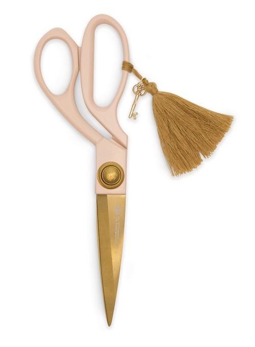 Te wyjątkowe nożyczki wykonane są ze stali nierdzewnej pokrytej miedzią i zakończone ozdobnym frędzlem z zawieszką.