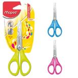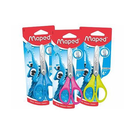 Nożyczki szkolne wykonane ze stali nierdzewnej. Grawerowane ostrza z zaokraglonymi końcami - O 10 mm. Plastikowe uchwyty profilem dostosowane do dziecięcej dłoni. Długość 13 cm. Miks 3 kolorów; niebieskie, zielone i różowe. Blister 1 szt.