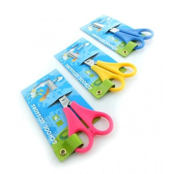 Nożyczki dla praworęcznych, o długości 13,5 cm, z ostrzem z stali nierdzewnej i linijką. Posiadają zaokrąglone ostrza oraz wygodne uchwyty.