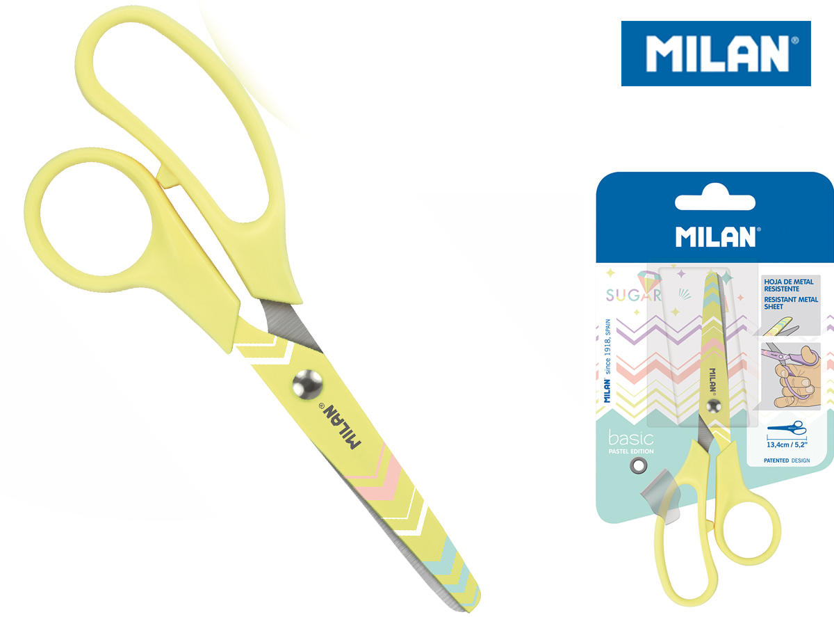 Nożyczki szkolne basic SUGAR DIAMONDS z plastikowymi uchwytami w pastelowych kolorach. Długość 13,4 cm. Ostrza z nierdzewnej stali zaokrąglone na końcach. Pakowane na blistrze, kolor żółty. Wymiary: 13,3 x 5,3 x 1,1 cm.
