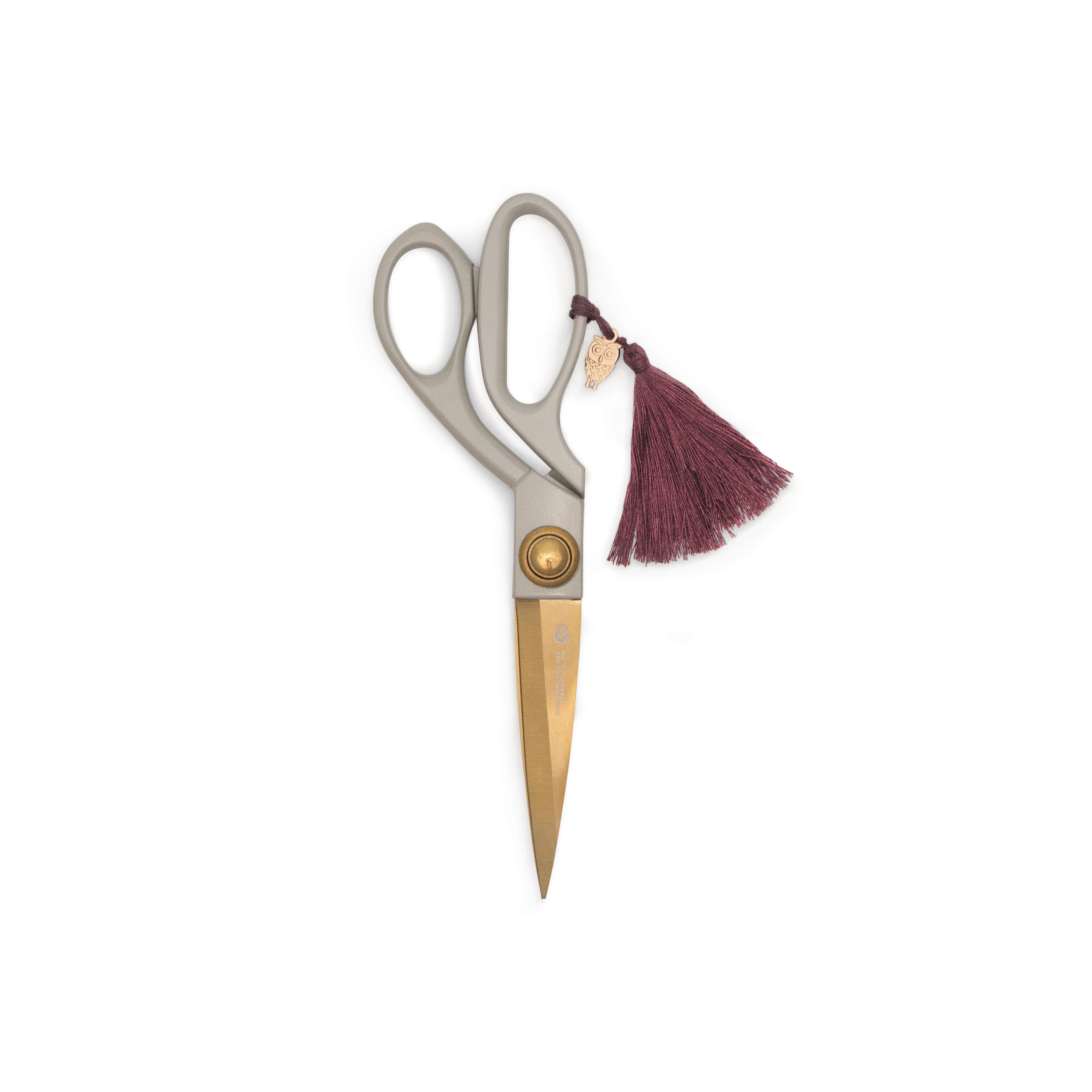 Te wyjątkowe nożyczki wykonane są ze stali nierdzewnej pokrytej miedzią i zakończone ozdobnym frędzlem z zawieszką.