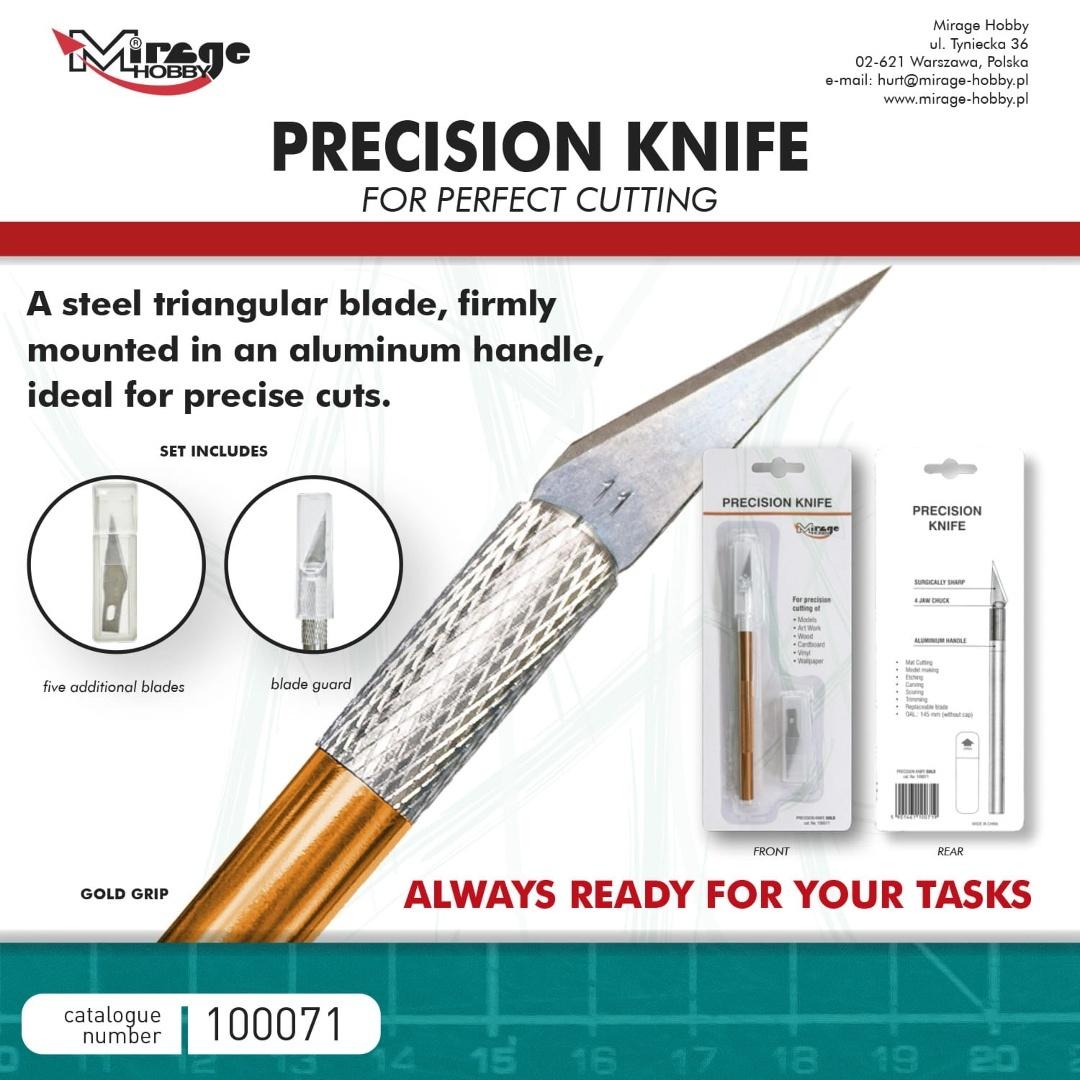 Precyzyjny nożyk modelarski. Stalowe trójkątne ostrze, mocno osadzone w aluminiowej rękojeści, idealne do precyzyjnych cięć. W zestawie opakowanie z dodatkowymi 5 ostrzami.