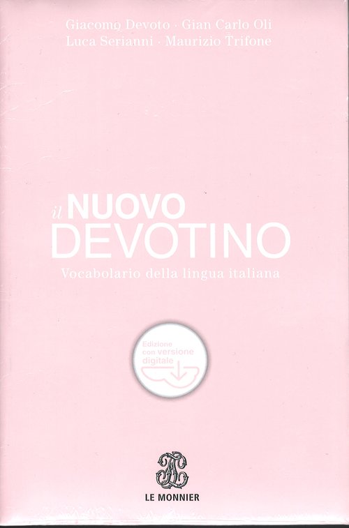Zaprojektowany, aby mieć cały język włoski pod ręką, New Devotino jest nieodzownym narzędziem do używania właściwego słowa i wyrażenia w odpowiednim kontekście: ważne jest, aby wyrazić siebie w jasny i odpowiedni sposób. Nowe wydanie zawiera: -60.000 wpisów, -10.000 słów podstawowego słownictwa wyraźnie oznakowanego, -500 neologizmów, -15.500 wyrażeń, -25.000 znaczeń słownictwa specjalistycznego (informatyki, biologii, medycyny, itp), -dzielenie i poprawnej wymowy wszystkich wpisów, -odmianę wszystkich nieregularnych, żeńskich i mnogich czasowników rzeczowników, przymiotników i zaimków, -regencji we wszystkich czasownikach. W wersji cyfrowej dla Windows, Mac, Linux, dostępnej do pobrania na swój komputer i na trzech innych, może być również używany z tablicą interaktywną i zawiera pełny tekst słownictwa, dźwięk z poprawną wymową wszystkich wpisów, w tym zagranicznych, pełna odmiana wszystkich czasowników, żeńskiej i mnogiej wszystkich rzeczowników, przymiotników i zaimków, 180.000 synonimy i antonimy związanych 33.000 przedmiotów.