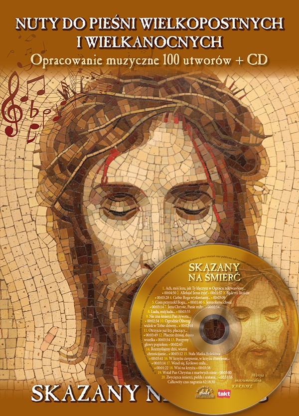 Nuty do pieśni wielkopostnych i wielkanocnych -Skazany na śmierć"" Książka może stanowić dodatek do publikacji ""Skazanyna śmierć"". Tytuł zawiera m.in.: 100 pieśni kościelnych, hymnów, psalmów, zarówno polskich, jak i łacińskich; opracowanie muzyczne każdego utworu - tekst,linięmelodyczną orazzapis harmoniczny na gitarę; notes muzyka - miejsce na zapis nut i tekstu utworów niezamieszczonych w niniejszym śpiewniku; płytęCD z klasycznymi, znanymi nam aranżacjami pieśni wielkopostnych i wielkanocnych w wersji instrumentalnej (karaoke).