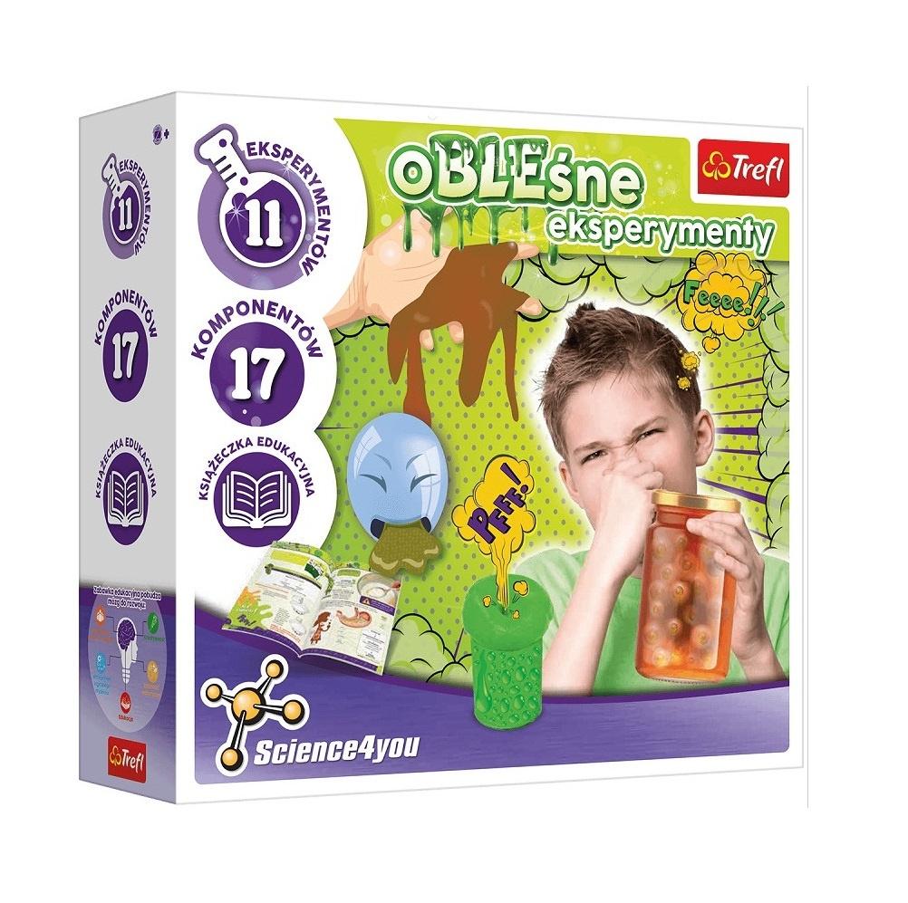 Obleśne eksperymenty to nowy zestaw do naukowej zabawy od marki Trefl z serii Science4You! W środku znajdziesz aż 18 komponentów oraz książeczkę edukacyjną, z której dowiesz się jak wykonać nietypową kupę, która może być zarówno płynna jak i stała, jak stworzyć odrażającego potwora ściekowego, jak przygotować sztuczne smarki i wymioty, jak symulować odgłos gazów i jak wpływają one na ludzkie życia i wielu innych, ciekawych, lecz obleśnych rzeczy!