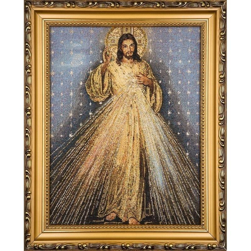 Podziwiaj wyjątkowe piękno i głębię wiary w tym haftowanym obrazie Jezusa Miłosiernego. Przedstawienie ikonicznego wizerunku "Jezu Ufam Tobie" według wizji św. Faustyny Kowalskiej zachwyca bogactwem kolorów i subtelnym blaskiem złotych nici, które nadają mu niepowtarzalny charakter. Tłem obrazu jest odcień niebieskiego, bogato zdobiony, co dodaje mu wyjątkowości i głębi. Całość oprawiona jest w elegancką, zdobioną złotą ramę o szerokości około 3 cm, która doskonale podkreśla jego artystyczną wartość. Obraz o wymiarach 22x27,5 cm będzie stanowił wyjątkową ozdobę każdego wnętrza i inspirujący element modlitwy.