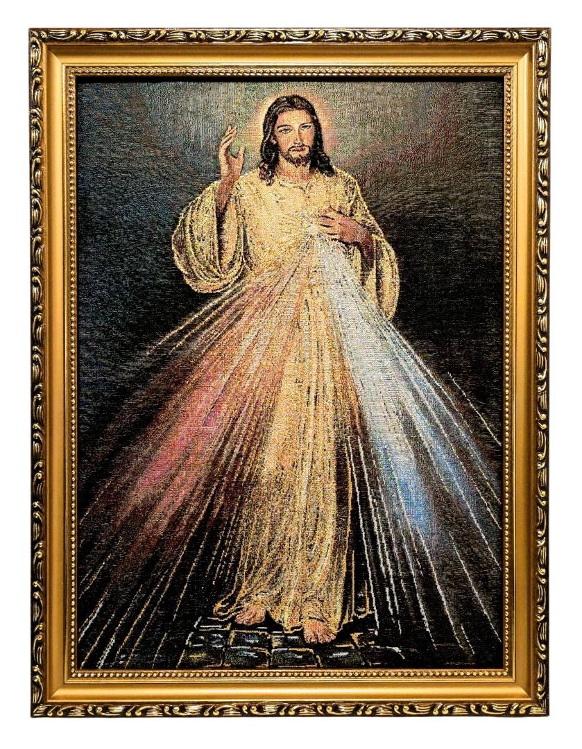 Ten kunsztownie wykonany obraz o wysokiej wartości artystycznej i duchowej jest świadectwem wiary i ufności w Boże Miłosierdzie. Każdy detal haftu został wykonany z dbałością o to, by jak najwierniej oddać powagę i miłość płynącą z wizerunku Chrystusa. Elegancka złota rama dodaje całości prestiżu i sprawia, że obraz jest kompletnym, gotowym do wyeksponowania dziełem. To idealny dar dla osób szukających duchowego wsparcia oraz piękna w sztuce sakralnej.