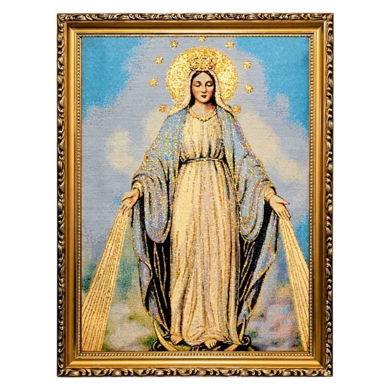 Haftowany Obraz Matka Boża Niepokalana na Tle Nieba - Złote Nici, Złota Rama (42x32 cm)