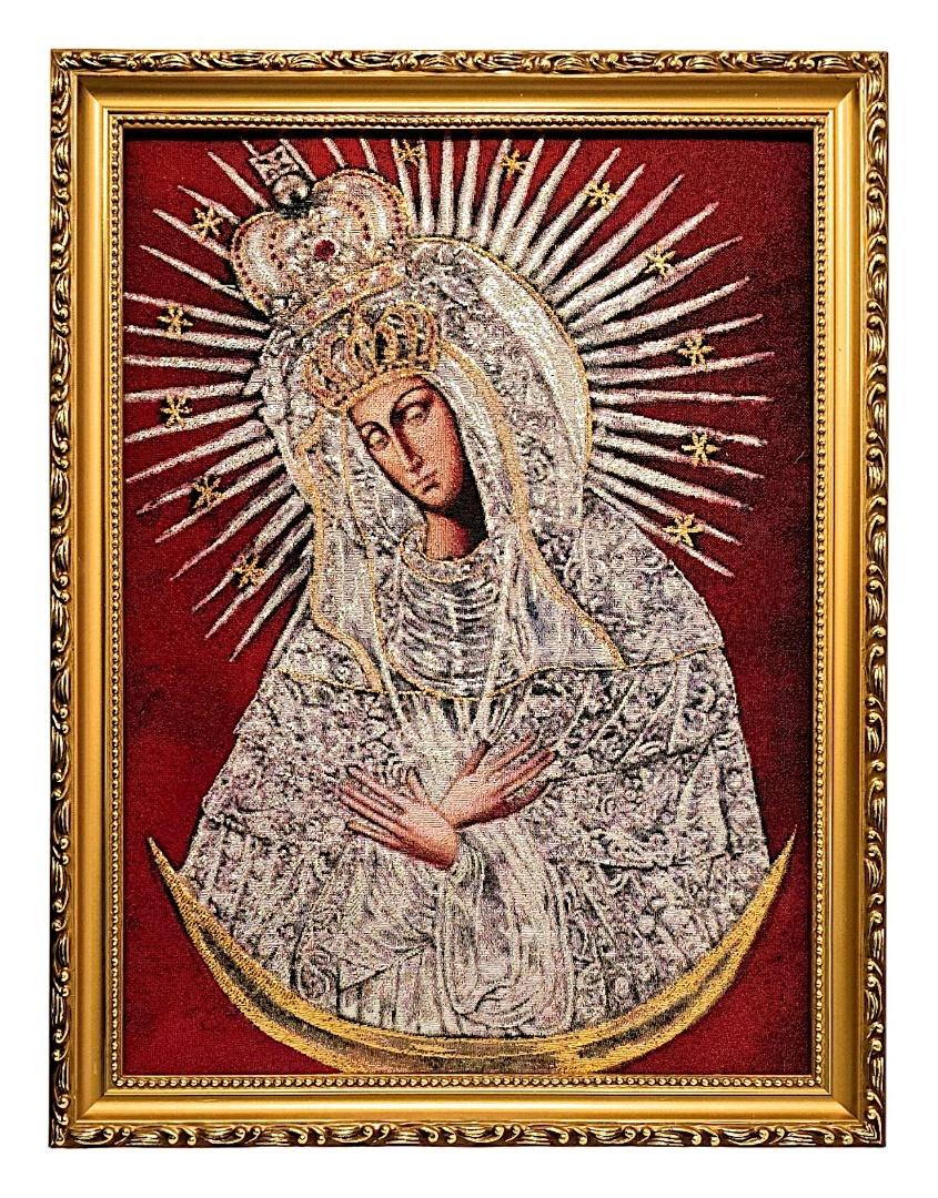 Odkryj niezwykłe połączenie królewskiego majestatu i duchowej głębi w tym haftowanym obrazie Matki Boskiej Ostrobramskiej. Wyjątkowe, intensywnie czerwone tło nadaje temu tradycyjnemu wizerunkowi niezwykłej energii i podniosłości, symbolizując jednocześnie żarliwą miłość oraz zwycięstwo wiary. To poruszające przedstawienie Matki Miłosierdzia, wykonane z dbałością o każdy detal, staje się centralnym punktem każdego wnętrza, emanując ciepłem i sakralnym blaskiem.