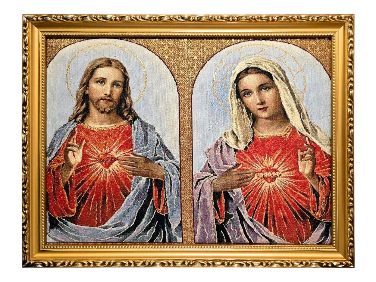 Haftowany Obraz Najświętsze Serca Jezusa i Maryi w Złotej Ramie - 42x32 cm