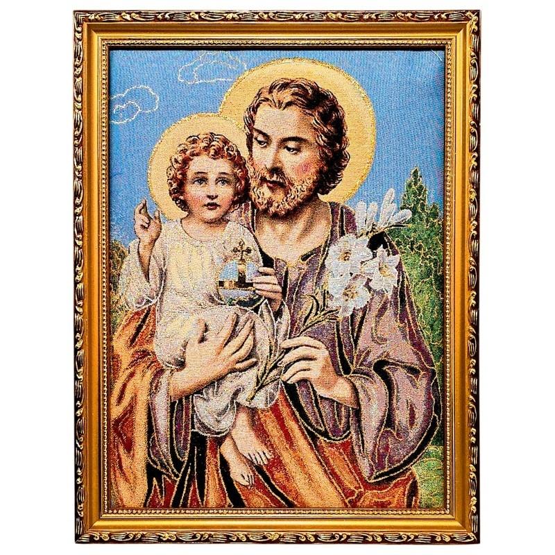 Haftowany Obraz Św. Józefa w Złotej Ramie - Z Dzieciątkiem Jezus i Lilią, 42x32 cm
