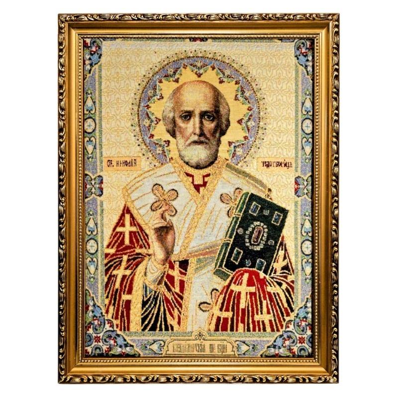 Haftowany Obraz Św. Mikołaj - Ikoniczne Przedstawienie w Złotej Ramie (42x32 cm)
