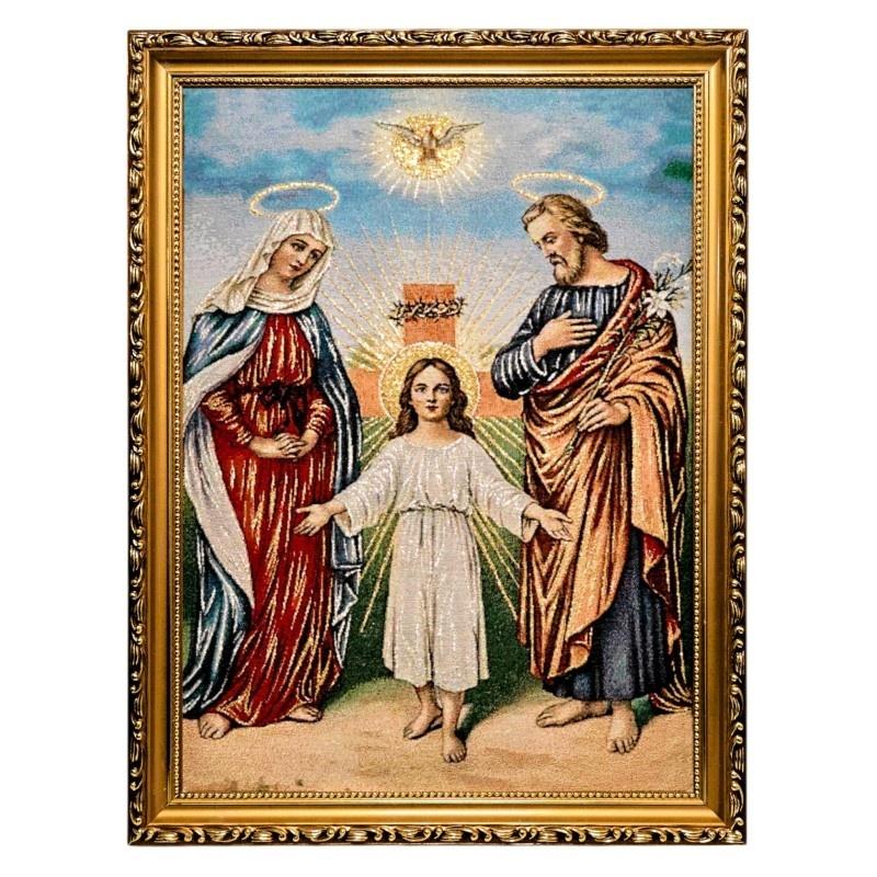 Wykonany z dbałością o detale, oddający miłość i oddanie Świętej Rodziny oraz boską misję Jezusa. Złote nici dodają obrazowi uroczystego i sakralnego charakteru. Elegancka złota rama podkreśla jego piękno i jest gotowa do zawieszenia. To idealny prezent dla osób ceniących duchowe wartości i poszukujących inspiracji w planie zbawienia.