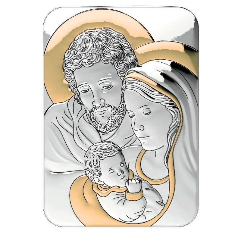 Wizerunek Świętej Rodziny jest wykonany ze srebra i bogato zdobiony złoceniami, które pięknie podkreślają detale, nadając scenie głębi, ciepła i szlachetności. Połączenie srebra ze złotymi akcentami dodaje obrazkowi wyjątkowego blasku i elegancji. Srebrny wizerunek jest umieszczony na solidnej, drewnianej podstawie, co dodaje mu naturalnego uroku i stabilności. Do obrazka dołączona jest również praktyczna podstawka, dzięki której jest on od razu gotowy do postawienia.