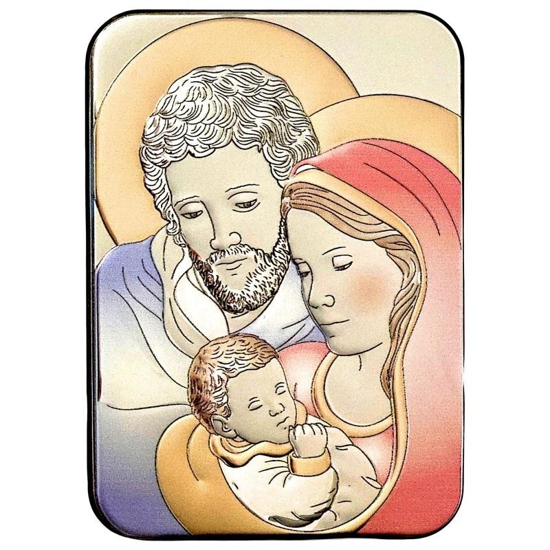 Wizerunek Świętej Rodziny jest przedstawiony w delikatnych kolorach, które harmonijnie łączą się ze srebrnym tłem, nadając scenie głębi i subtelności. Obrazek jest wykonany ze srebra, a jego powierzchnia została częściowo kolorowana, co pięknie podkreśla detale i dodaje mu wyrazistości. Srebrny, kolorowany wizerunek jest umieszczony na solidnej, drewnianej podstawie, co dodaje mu naturalnego uroku i stabilności. Do obrazka dołączona jest również praktyczna podstawka, dzięki której jest on od razu gotowy do postawienia.