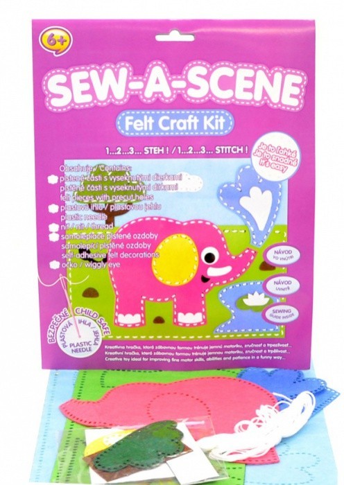 Zestaw zawiera: filcowe części z wyciętymi otworami, plastikową igłę, nici, ozdoby.