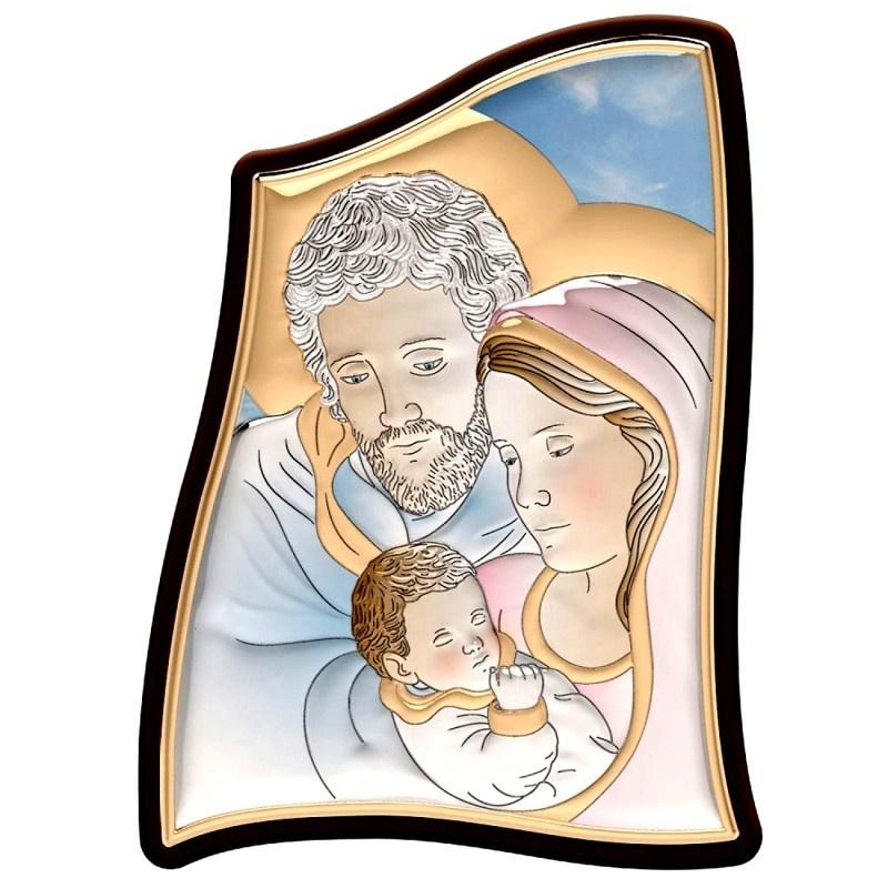 Wizerunek Świętej Rodziny jest przedstawiony w delikatnych kolorach, które harmonijnie łączą się ze srebrnym tłem, nadając scenie głębi i subtelności. Obrazek jest wykonany ze srebra, a jego powierzchnia została częściowo kolorowana, co pięknie podkreśla detale i dodaje mu wyrazistości. Srebrny, kolorowany wizerunek jest umieszczony na solidnej, drewnianej podstawie, co dodaje mu naturalnego uroku i stabilności. Do obrazka dołączona jest również praktyczna podstawka, dzięki której jest on od razu gotowy do postawienia.