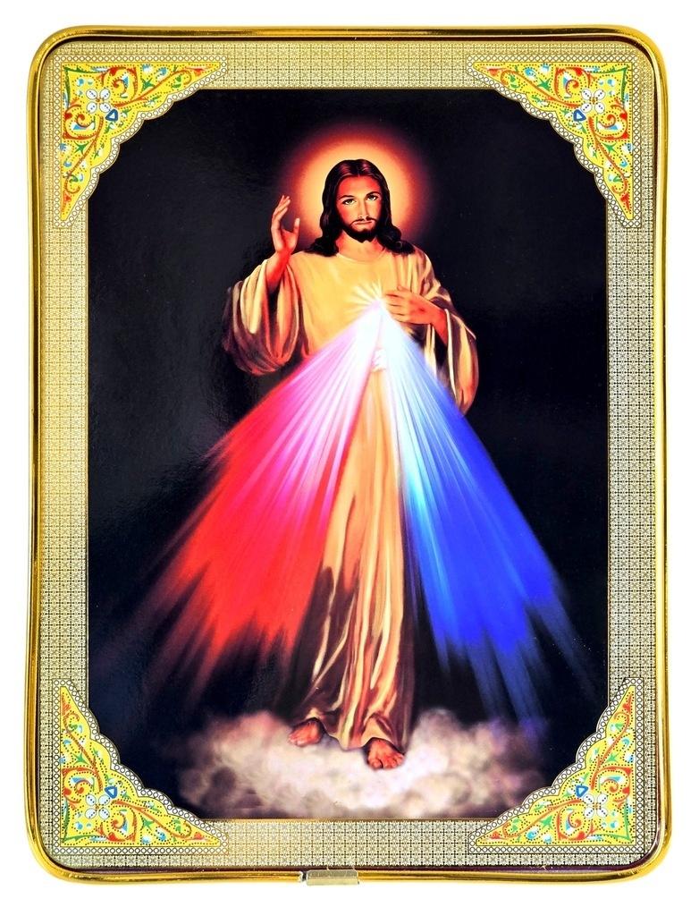 Odkryj głęboką symbolikę i piękno obrazu przedstawiającego Jezusa Miłosiernego. Jezus z uniesioną ręką w geście błogosławieństwa, wskazuje drugą ręką na swoje gorejące Serce, z którego wypływają promienie miłosierdzia. Złote zdobienia umieszczone jedynie w rogach obrazka dodają mu subtelnej elegancji i blasku. Obrazek o wymiarach 15x20 cm,oprawiony w złotą, plastikową ramkę, idealnie nadaje się do postawienia na półce, będąc pięknym elementem dekoracyjnym i duchowym.