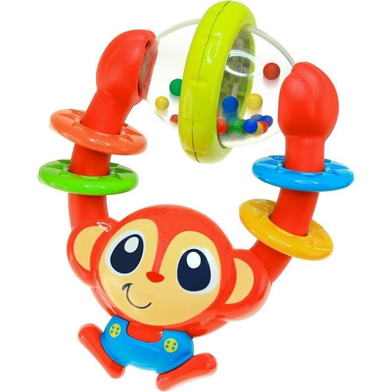 Grzechotka w kształcie małpki zapewni maluszkowi wspaniałą rozrywkę! Na łapkach zwierzaka umieszczone są ruchome obręcze o zróżnicowanej fakturze, a w pojemniczku, który trzyma znajdują się kolorowe koraliki. Przy potrząsaniu, zabawka wesoło grzechocze.