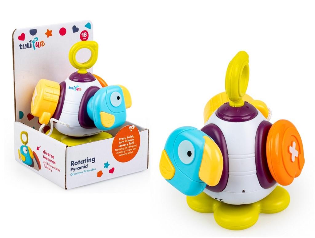 Praktyczna zabawka w kompaktowym rozmiarze zapewni maluchowi zręcznościową rozrywkę, niezależnie od miejsca, w którym się znajduje. Na każdej ze ścianek piramidki kryje się inne zadanie do wykonania: obrotowy element, piszczący ptaszek do naciskania, wtyczka do dopasowania w otwory i wciskania, a także terkoczący element do przekręcania. Po ustawieniu piramidki na kwiatku, zdobiącym jedną ze ścianek, można nią kręcić za pomocą paluszka.