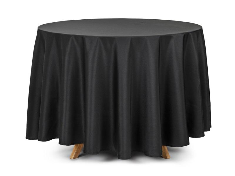 Obrus na stół z matowego materiału w kolorze czarnym, okrągły, średnica 230 centymetrów.