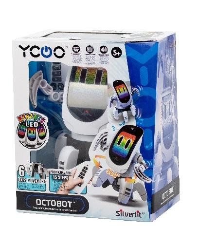 Wesoły stworek porusza odnóżami, na wzór ośmiornicy, wykonując zadane mu polecenia! W zestawie, poza robotem, znajduje się pilot z przyciskami oznaczonymi ikonkami, a każdemu z nich przypisana jest inna funkcja. Programuj robota, zadając mu do 15 poleceń, aby odtworzył sekwencję ruchów w niezmienionej kolejności. Stworek porusza się w charakterystyczny sposób, przekręcając tułów wraz z głową dookoła własnej osi, a następnie podążając w zadanym mu kierunku. Octobot potrafi także tańczyć i to na trzy różne sposoby. Zabawę uatrakcyjnia dynamiczny wyświetlacz LED.
