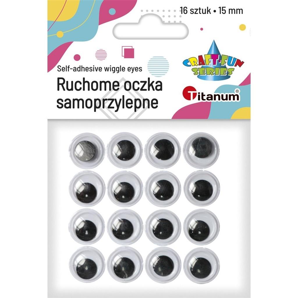 Oczy samoprzylepne, okrągłe, bez rzęs. Średnica: 15 mm. 16 szt.