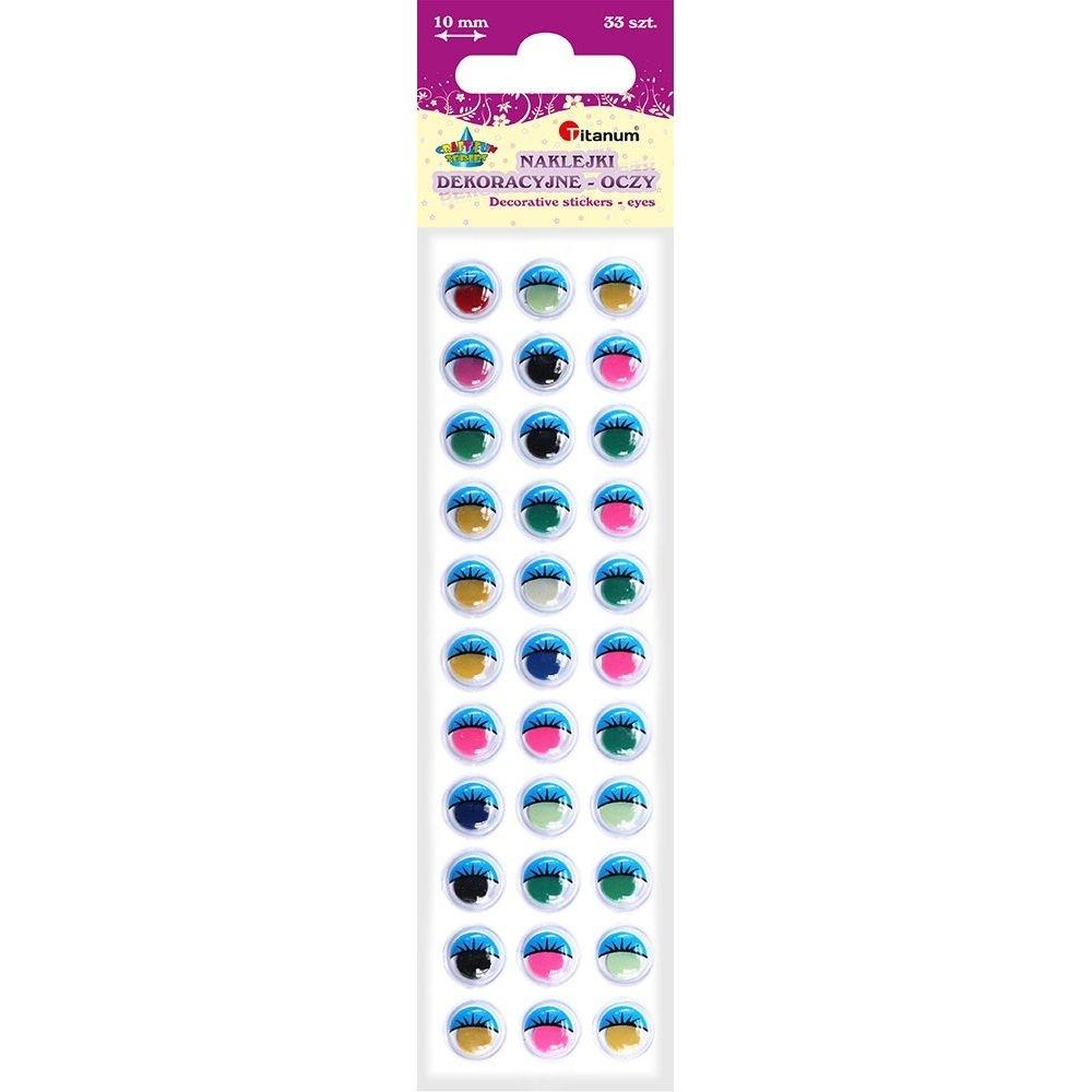 Oczy samoprzylepne, okrągłe, z rzęsami, kolorowe źrenice. Średnica: 10 mm. 33 szt.