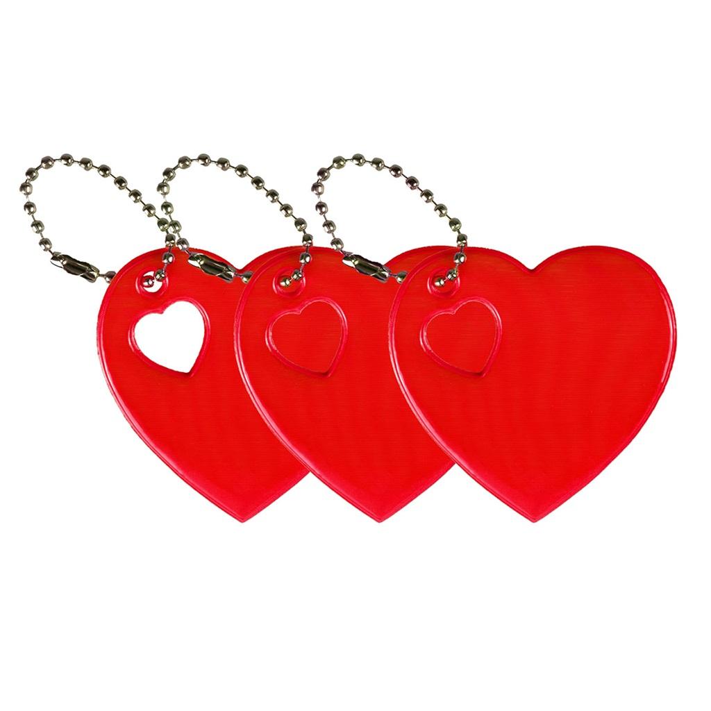 Odblaskowe breloczki o wymiarze 5 cm x 5 cm na łańcuszku. Idealne jako element dekoracyjny plecaka, kurtki, torebki. Odblaskowe breloczki pełnią ważną rolę po zmroku, zwiększają widoczność pieszego. Uniwersalny gadżet, może być dodatkiem do prezentu walentynkowego, urodzinowego. Breloki w kolorze czerwonym. W opakowaniu znajdują się 3 sztuki.