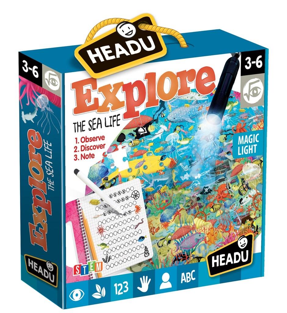 POZNAJ MORSKIE ŻYCIE Ułóż puzzle, a następnie dokładnie obserwuj ilustrację i odkryj przedmioty znajdujące się w morzu. Za pomocą specjalnej latarki zobaczysz niewidoczne gołym okiem elementy. Odnotuj swoje odkrycia w notesie. Zawartość: 70 puzzli, notes, flamaster, latara UV (wymagana bateria 3 x AAA 1.5 V - niedołączone), instrukcja.