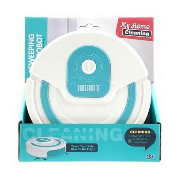 Zabawka robot sprzątający w białym kolorze z niebieskimi elementami. Wymiary opakowania są wymiarami pudełka. Zabawka przeznaczona dla dzieci od lat 3. Zabawka działa na baterie typu AA. Baterie nie są załączone do zabawki.