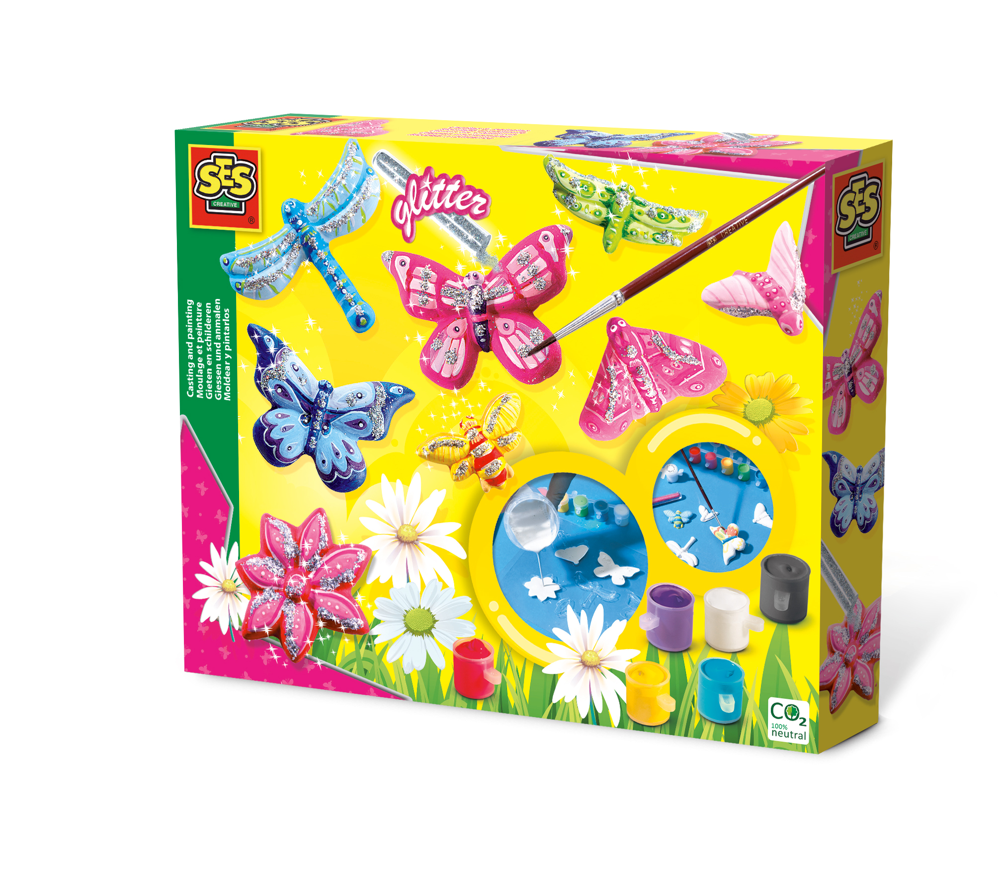 Zestaw do wykonywania odlewów gipsowych – kolorowych motyli. W komplecie znajduje się: plastikowa forma do zrobienia odlewów różnych motylków, puder gipsowy, 6 kolorowych farb, pędzelek, instrukcja. Rozwijaj swoją kreatywność, umiejętności i wiedzę w przyjemny i bezpieczny sposób z produktów SES Creative. Zestaw dla dzieci w wieku 5+. Wyprodukowano w Holandii.