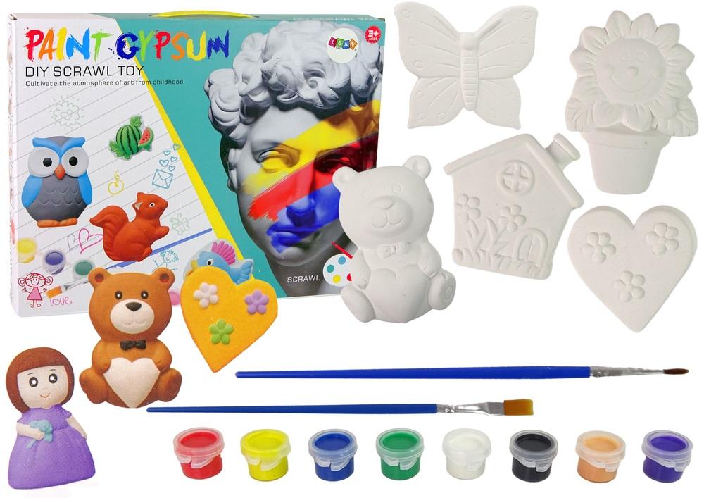 Zestaw Odlewy Gipsowe Do Malowania Farby Figurki Dziewczynek Miś Rozwijanie kreatywności u małych dzieci jest szczególnie istotne w czasie, kiedy zaczynają się integrować z rówieśnikami. Wspólne prace plastyczne wpływają pozytywnie na relacje międzyludzkie oraz uczą dzieci kooperacji. Zabawka nauczy skupienia uwagi na odlewie oraz sprawności łatwego uczenia się i przyswajania wiedzy. Małe elementy ćwiczą precyzję i koordynacje, co zaprocentuje również w szkole. Dwanaście różnych wzorów pozwoli na spędzenie wspólnie czasu na zabawie, wystarczy wziąć pędzelki oraz farby i rozpocząć malowanie. Zmień się w artystę i rozpocznij malowanie! Zestaw przedstawia dziewczynki z różnymi fryzurami i ubraniami, domek, misia i inne. Po wyschnięciu pomalowanych odlewów specjalne naklejki umożliwią przyklejenie zabawek do powierzchni. Można przyozdobić nimi ramkę lub mebel. Elementy zestawu to: - zestaw 8 farbek - dwa pędzelki - zestaw 12 foremek gipsowych - naklejki Wymiary gipsu: około 8 cm x 7 cm x 2 cm Wymiary opakowania: 43 cm x 33 cm x 5 cm Zabawka przeznaczona dla dzieci powyżej 3 roku życia. Zgodne z certyfikatem CE i zgodne z normą EN71.