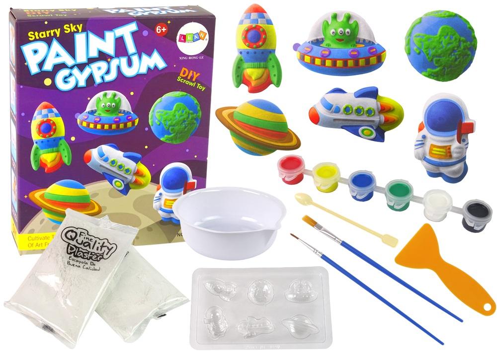 Zestaw DIY Do Malowania Kosmos Gips Magnesy Rozwijanie kreatywności u małych dzieci jest szczególnie istotne w czasie, kiedy zaczynają się integrować z rówieśnikami. Wspólne prace plastyczne wpływają pozytywnie na relacje międzyludzkie oraz uczą dzieci kooperacji. Przedstawiamy zestaw DIY, dzięki któremu można stworzyć babeczki, a następnie je pomalować. Kolorowy zestaw do tworzenia magnesów na lodówkę to idealna rozrywka zarówno dla młodszych, jak i starszych. Za pomocą znajdującego się w zestawie gipsu można stworzyć elementy nawiązane do kosmosu. Jak rozpocząć kreatywną zabawę? 1. Gips należy rozrobić z wodą zgodnie z informacjami podanymi w instrukcji, wypełnić nim przygotowane formy, a następnie odstawić do wyschnięcia. 2. Po wyschnięciu stworzonych kształtów można usunąć je z foremek 3. Dowolnie pomalować dołączonymi do zestawu kolorowymi farbkami. 4. Po zakończeniu ozdabiania do kształtów przyklej odpowiedniej długości magnes. Po wykonaniu wszystkich kroków magnesiki własnej produkcji są gotowe! Elementy zestawu to: - foremka z formami w kształcie kosmosu - opakowanie z gipsem - zestaw 6 farbek - pędzelek - instrukcja obsługi zestawu Wymiary foremki: 4 cm x 5 cm x 2 cm Wymiary opakowania: 18 cm x 22 cm x 5 cm Zabawka przeznaczona dla dzieci powyżej 6 roku życia. Zgodne z certyfikatem CE i zgodne z normą EN71.