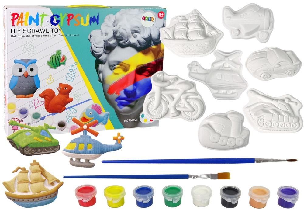 Zestaw Kreatywny Odlewy Gipsowe Do Malowania Farby Pojazdy Auto Rozwijanie kreatywności u małych dzieci jest szczególnie istotne w czasie, kiedy zaczynają się integrować z rówieśnikami. Wspólne prace plastyczne wpływają pozytywnie na relacje międzyludzkie oraz uczą dzieci kooperacji. Zabawka nauczy skupienia uwagi na odlewie oraz sprawności łatwego uczenia się i przyswajania wiedzy. Małe elementy ćwiczą precyzję i koordynacje, co zaprocentuje również w szkole. Dwanaście różnych wzorów pozwoli na spędzenie wspólnie czasu na zabawie, wystarczy wziąć pędzelki oraz farby i rozpocząć malowanie. Zmień się w artystę i rozpocznij malowanie! Zestaw przedstawia różne pojazdy takie jak: autobus, czołg, auto, statek, rower i inne. Po wyschnięciu pomalowanych odlewów specjalne naklejki umożliwią przyklejenie zabawek do powierzchni. Można przyozdobić nimi ramkę lub mebel. Elementy zestawu to: - zestaw 8 farbek - dwa pędzelki - zestaw 12 foremek gipsowych - naklejki Wymiary gipsu: około 8 cm x 7 cm x 2 cm Wymiary opakowania: 43 cm x 33 cm x 5 cm Zabawka przeznaczona dla dzieci powyżej 3 roku życia. Zgodne z certyfikatem CE i zgodne z normą EN71.