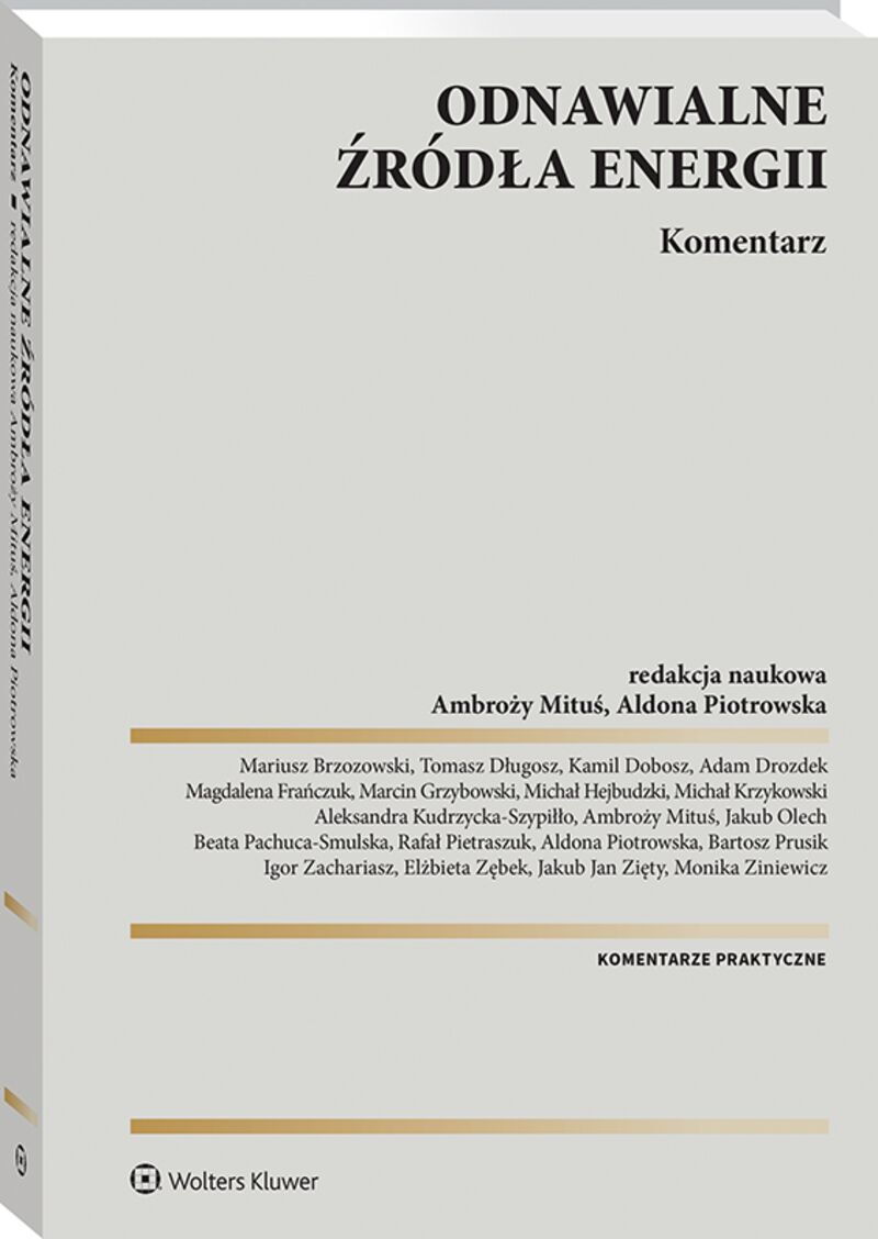 Opracowanie jest praktycznym komentarzem do podstawowej ustawy regulującej zasady i realizującej kluczowe cele o charakterze klimatycznym, dotyczącej rozwoju i promocji wytwarzania energii ze źródeł odnawialnych. Najważniejsze regulacje dotyczą: • zmniejszenia negatywnego odziaływania na środowisko poprzez ograniczenie zależności od paliw kopalnych (węgla, ropy, gazu) oraz redukcję emisji gazów cieplarnianych; • zwiększenia bezpieczeństwa energetycznego kraju; • przyczynienia się do transformacji energetycznej i realizacji zasady zrównoważonego rozwoju oraz wzmocnienia alternatywnych źródeł wytwarzania energii elektrycznej, gazu i ciepła; • wspierania wytwórców prosumentów i tzw. energetyki rozproszonej. Książka szczególnie zainteresuje prawników zajmujących się obsługą prawną inwestycji w zakresie energetyki odnawialnej, a także inwestorów i przedsiębiorców z branży energetycznej oraz przedstawicieli organów administracji publicznej i innych instytucji zajmujących się tą problematyką