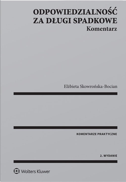Drugie wydanie publikacji zawiera omówienie problematyki odpowiedzialności za długi spadkowe, a także analizę zmian wprowadzonych ustawą z 20.03.2015 r. o zmianie ustawy – Kodeks cywilny oraz niektórych innych ustaw. Autorka komentuje zmienione przepisy, ujmując je całościowo, opisuje również nowe uregulowania w zakresie odpowiedzialności za długi spadkowe i spłacania długów spadkowych, a w szczególności: - odmienną niż dotychczas fikcję prawną związaną z niezłożeniem przez spadkobiercę oświadczenia co do spadku. - nową instytucję w Kodeksie cywilnym – wykaz inwentarza, który pozwala spadkobiercy oraz wierzycielom spadku na zorientowanie się w stanie majątku spadkowego: wielkości długów spadkowych oraz wartości aktywów. Zmiany te zostały przedstawione wraz z ogólnym omówieniem zasad odpowiedzialności za długi spadkowe nie tylko spadkobierców, lecz także osób, na rzecz których ustanowione zostały zapisy windykacyjne, a w pewnych sytuacjach również osób obdarowanych przez spadkodawcę. W obecnym wydaniu rozważania zostały rozszerzone, autorka uwzględniła bowiem opracowania doktrynalne z ostatnich dwóch lat. O unikatowości komentarza stanowi przejrzystość i zwięzłość wywodów.