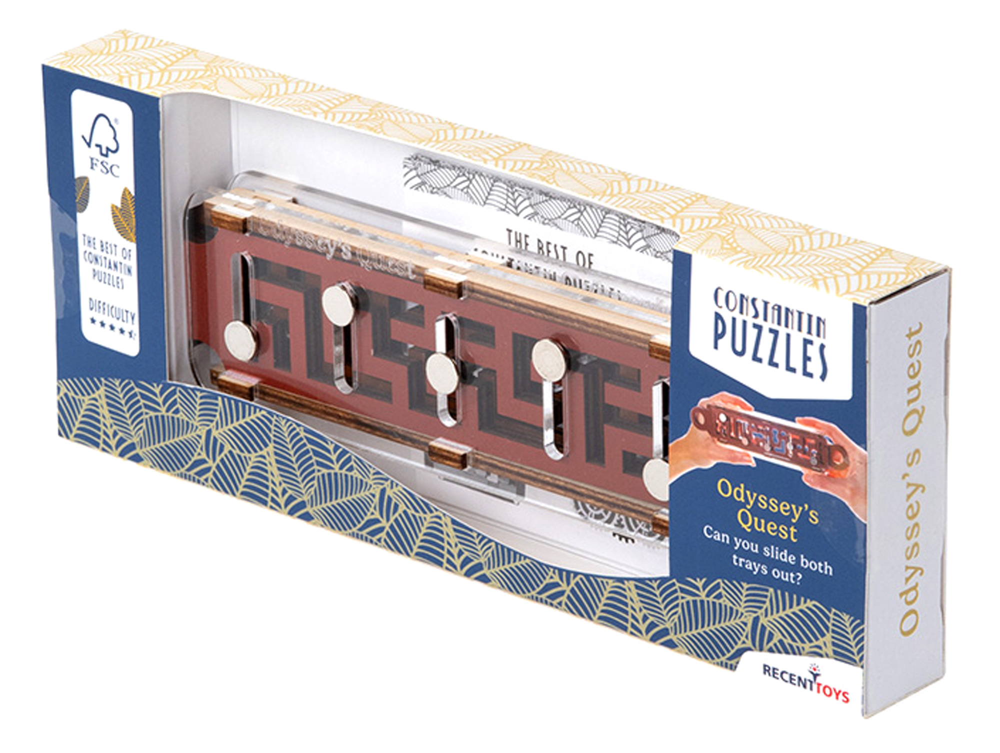 Zachowanie delikatnej równowagi pomiędzy prawą i lewą stroną wymaga przemyślanych ruchów. Przesunięcie szpilek może na chwilę uwolnić jedną stronę, tylko po to, aby zablokować drugą. Rozdziel obie części, a następnie przywróć je do pierwotnej pozycji. Jean Claude Constantin jest niewątpliwie jednym z najbardziej zapracowanych projektantów łamigłówek ostatnich trzydziestu lat. Wyjątkowe i różnorodne pomysły, które powstają w jego głowie, przemieniają się w unikalne i wizualnie zachwycające projekty. Łamigłówki Jean Claude'a uznawane są za bardzo wymagające. Aby je rozwiązać, będziesz potrzebował dużej aktywności szarych komórek, odpowiedniej koncentracji i odrobiny wyobraźni. Recent Toys to producent łamigłówek z Holandii. Jak sami o sobie mówią: "Tworzą zagadki dla wszystkich." Jeżeli lubisz matematykę, logikę, układanie wzorów lub po prostu jesteś cierpliwy i wytrwały, to na pewno znajdziesz coś dla siebie! Choć wszystkie łamigłówki są unikatowe to mają one następujące cechy wspólne: 1. Prostota - zagadki są łatwe do wytłumaczenia. Nasz umysł ma się skupić na rozwiązaniu łamigłówki, a nie na zrozumieniu zasad. 2. Mądrość - łamigłówki są zaprojektowane tak, aby zmusić nasz umysł do poszerzenia horyzontów i otwarcia na nowe pomysły. 3. Wytrzymałość - łamigłówki zbudowane są z odpowiednich materiałów. Elementy można przesuwać z wyjątkową łatwością. Chodzą płynnie, szybko i się nie zacinają. ZAWARTOŚĆ: łamigłówka Odyssey's Quest (wymiary: 5x20 cm) książeczka