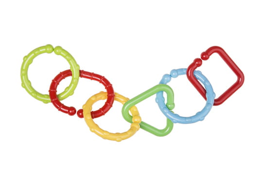 Ogniwa służące do łączenia oraz mocowania zabawek przy łóżeczku, wózku czy macie edukacyjnej. Dzięki różnorodnym wypustkom nadają się również do ćwiczeń integracji sensorycznej.