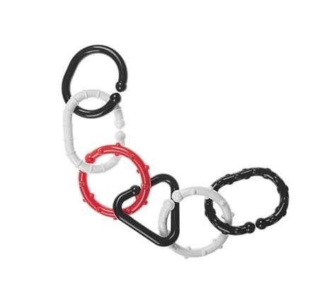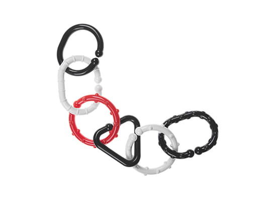 Ogniwa służące do łączenia oraz mocowania zabawek przy łóżeczku, wózku czy macie edukacyjnej. Czarno-biała kolorystyka idealnie stymuluje zmysł wzroku niemowlaka. Dzięki różnorodnym wypustkom nadają się również do ćwiczeń integracji sensorycznej.