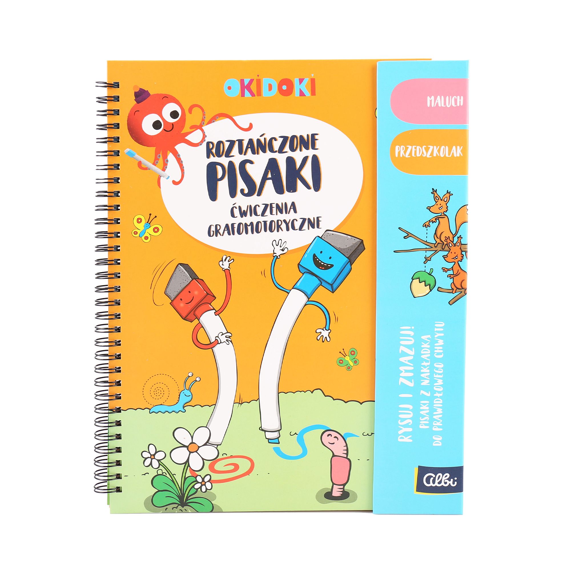 W zestawie: 50 stron z zadaniami (spiętych spiralą), 2 pisaki zmazywalne z gąbką nakładkami do prawidłowego chwytu.