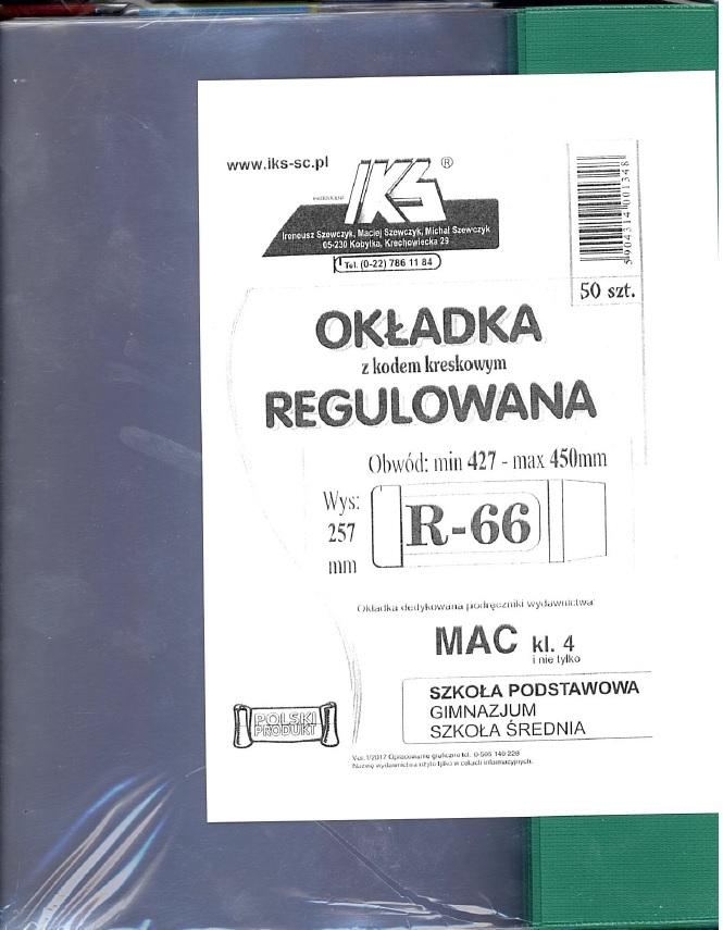 Okładki regulowane, wykonane z folii wysokoprzeźroczystej. Zakładka z folii kolorowej. Do każdego opakowania dołączany jest spis książek pasujących do danej okładki. Okładka dedykowana na podręczniki wydawnictwa MAC.