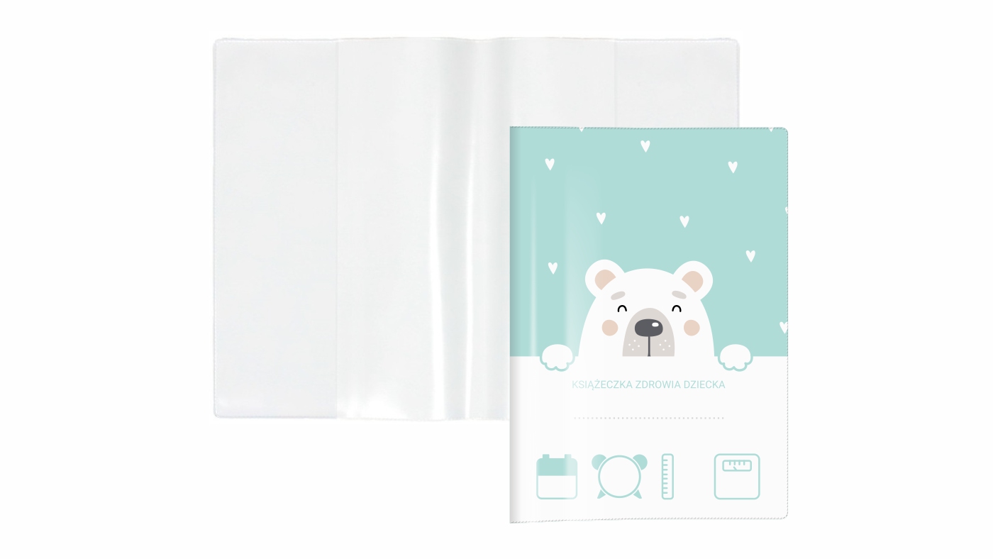 Okładki wykonane z białej folii z ozdobnym nadrukiem. Na wewnętrznej stronie okładki szerokie kieszenie pozwalające na przechowywanie recept, wyników badań czy skierowań. Możliwość personalizacji. Dopasowana do wymiaru książeczki zdrowia dziecka.