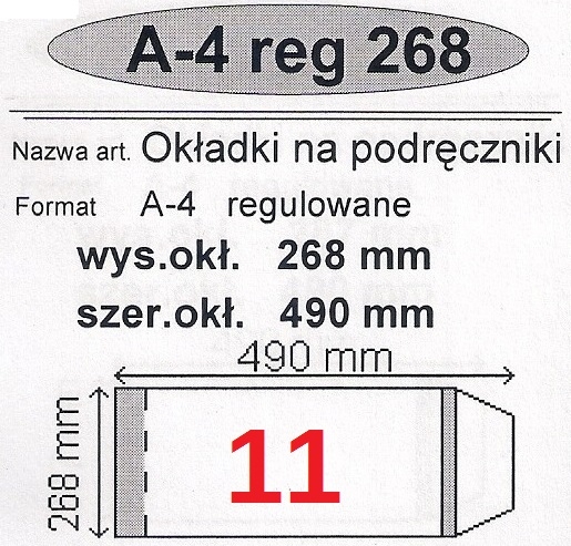 Okładki regulowane. Wykonane z folii wysokoprzeźroczystej. Zakładka z folii kolorowej. Do każdego opakowania dołączany jest spis książek pasujących do danej okładki. Ten rozmiar pasuje na: Szkoła podstawowa -J. Polski - Słowa na start  (podręcznik) kl.4,5,6 NOWA ERA -J. Polski - Teraz polski (podręcznik) kl.4,5,6 NOWA ERA -I gra muzyka (podręcznik i ćwiczenie) kl.4,5,6 NOWA ERA -Plastyka - Do dzieła kl.4,5,6 NOWA ERA -Żywa lekcja historii (podręcznik) kl.4,5,6 NOWA ERA -Technika - Jak to działa? (podręcznik) kl.4,5,6 NOWA ERA Gimnazjum -J. Polski - Słowa na czasie (podręcznik) kl.1,2,3, NOWA ERA -J. Polski - Swoimi słowami (podręcznik) kl.1,2,3 NOWA ERA -Historia - Śladami przeszłości kl.1,2,3 NOWA ERA -Gra muzyka kl.1,2,3 NOWA ERA Szkoła ponadgimnazjalna -J. Polski - Ponad słowami (podręcznik )kl.1,2,3 -Historia - Poznać przeszłość. Wiek XX (podręcznik) kl.1,2,3 NOWA ERA -Spotkanie z kulturą kl.1,2,3 NOWA ERA                    Zapytaj o WZORNIK który ułatwia dobranie odpowiedniej okładki do książki.
