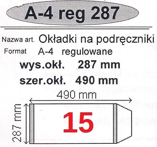 Okładki regulowane. Wykonane z folii wysokoprzeźroczystej. Zakładka z folii kolorowej. Do każdego opakowania dołączany jest spis książek pasujących do danej okładki. Ten rozmiar pasuje na: Szkoła podstawowa -Plastyka - Długie dzieje sztuki kl.4,5,6 WSIP -Muzyka i my (podręcznik) kl.4,5,6 WSIP -Plastyka - Na ścieżkach wyobraźni kl.4,5,6 WSIP -My i historia kl.4,5,6 PWN -NEW BINGO! Plus j.angielski A.Wieczorek PWN -HELLO j.angielski PWN -Go international j.angielski PWN Gimnazjum -DACHfenster j.niemiecki PWN -www.weiter deutsch j.niemiecki PWN -Kompass j.niemiecki PWN -Aha! Neu j.niemiecki WSIPEcho j. Rosyjski WSIP Szkoła ponadgimnazjalna -Abitur j.niemiecki WSIP -Dialog j. Rosyjski WSIP -WOT I MY j.rosyjski PWN                    Zapytaj o WZORNIK który ułatwia dobranie odpowiedniej okładki do książki.