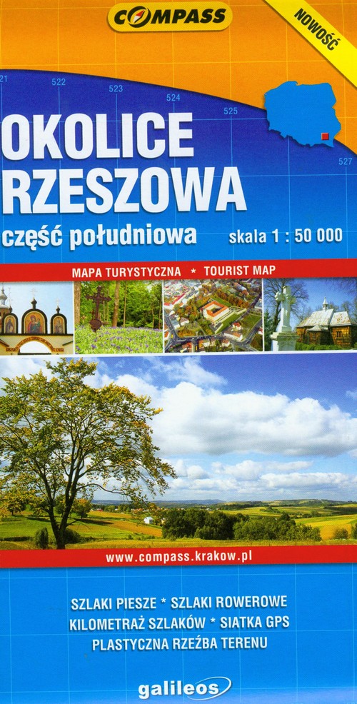 Mapa turystyczna południowej części okolic Rzeszowa wydana w skali 1:50 000. Szlaki piesze, rowerowe, kilometraż szlaków, siatka GPS, plastyczna rzeźba terenu.
