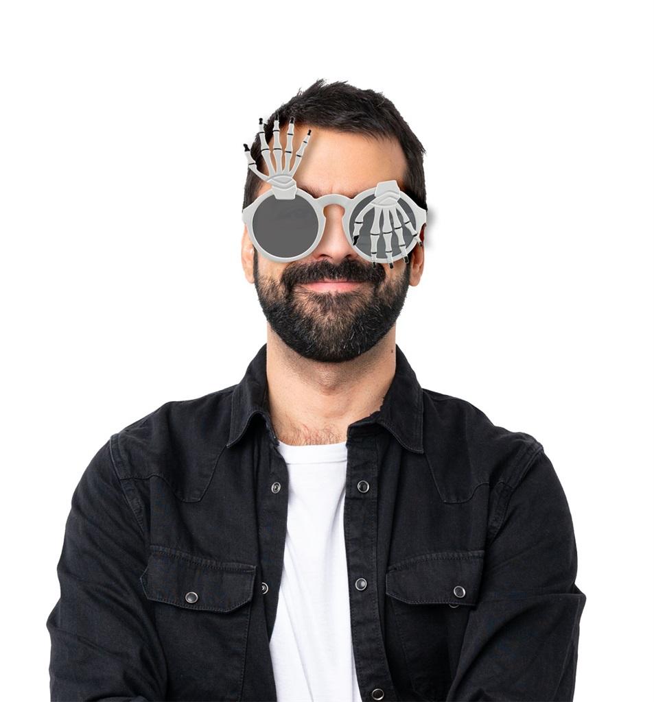 Zabawne okulary w kolorze białym z łapkami kościotrupa. Jedna łapka nachodzi na szkło przeciwsłoneczne, druga odchodzi ku górze. Element kostiumu na bal karnawałowy, halloween bądź samodzielny zabawny gadżet. W opakowaniu znajduje się 1 sztuka.
