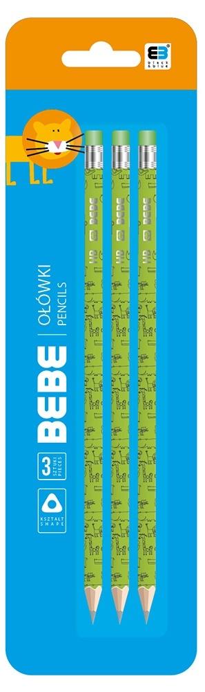 3 ołówki z gumką w intensywnym zielonym kolorze na blistrze. Na ołówku zadruk z wizerunkami zwierzaków B&B ze słonecznego safari. Trójkątny profil ołówka poprawia komfort jego użytkowania.