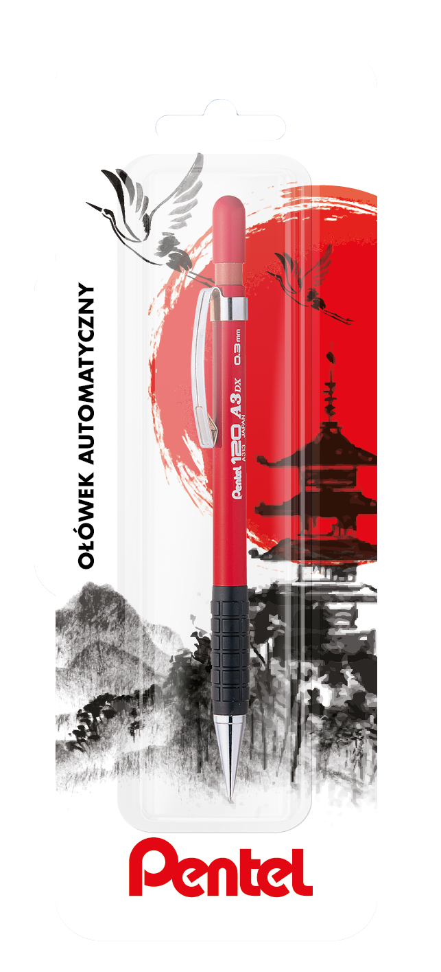 Specjalistyczy ołówek automatyczny. Idealny do prac kreślarskich, wykresów, jak również do zwykłego pisania. Posiada metalowy mechanizm zaciskowy, zdejmowany klips oraz gumkę wymienną. Dostępny w grubości: 0,3 mm - czerwony kolor obudow. Pakowany na blistrze x 1 sztuka.